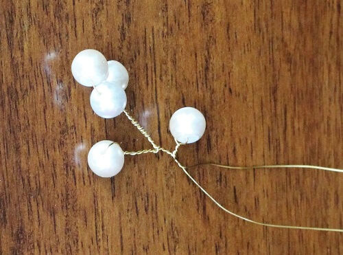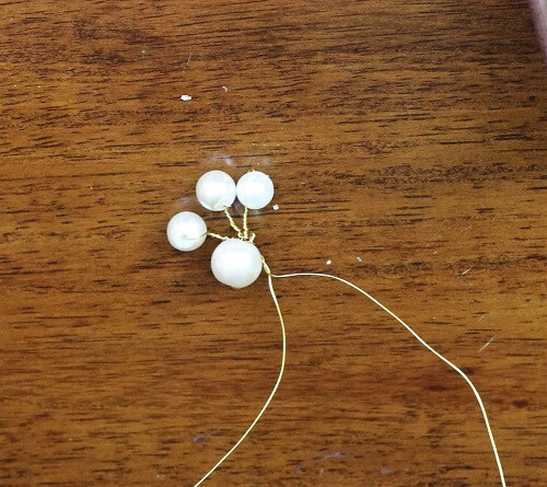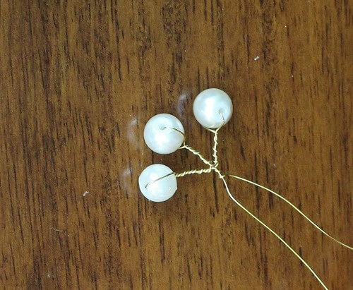 1. Start by cutting the jewelry wire by 20 inches. Insert 1 pearl from one end of the wire. Twist the wire. Add another pearl and twist again. Continue to make it in a similar fashion for one more pearl.