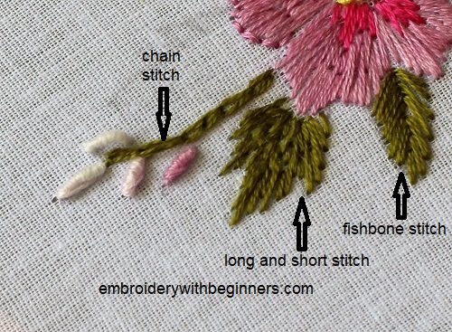 You can see the stitches that I have made in the design. Fishbone, long and short stitch and chain stitch are used in this particular tutorial.