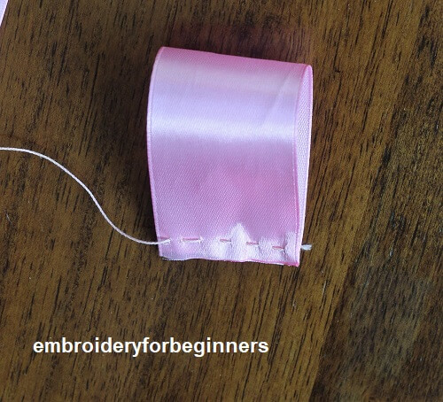 1. Secure the edges of the ribbon by passing through the flame of the lighter. Stitch the ends of the ribbon together as shown in the above picture.