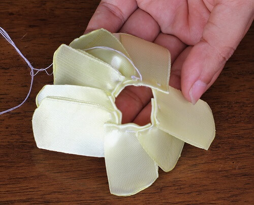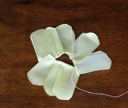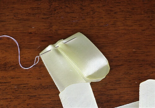 2. Next, fold in the ribbons in half and stitch them as shown above.