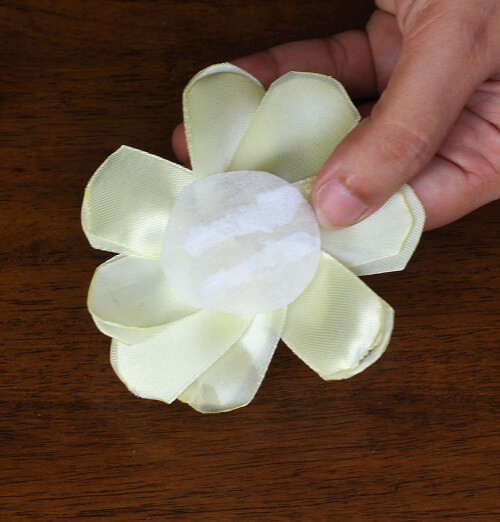 7. Place the ribbon flower over it. You can now decorate the center with ribbon, stones or beads of your choice. Turn over and stick the clip, rubber band or pin with the help of a glue gun.